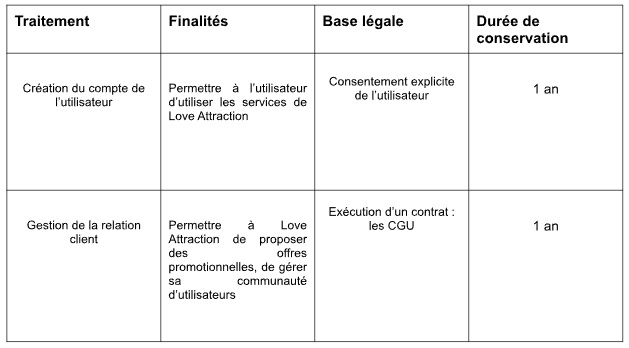 L’utilisateur peut retirer son consentement au traitement de ses données personnelles à tout moment. Certains consentements peuvent être retirés directement depuis l’application LOVE ATTRACTION. Nous rappelons aux utilisateurs que nous pouvons traiter leurs données personnelles sans leurs consentement explicite pour certaines finalités selon la règlementation applicable.